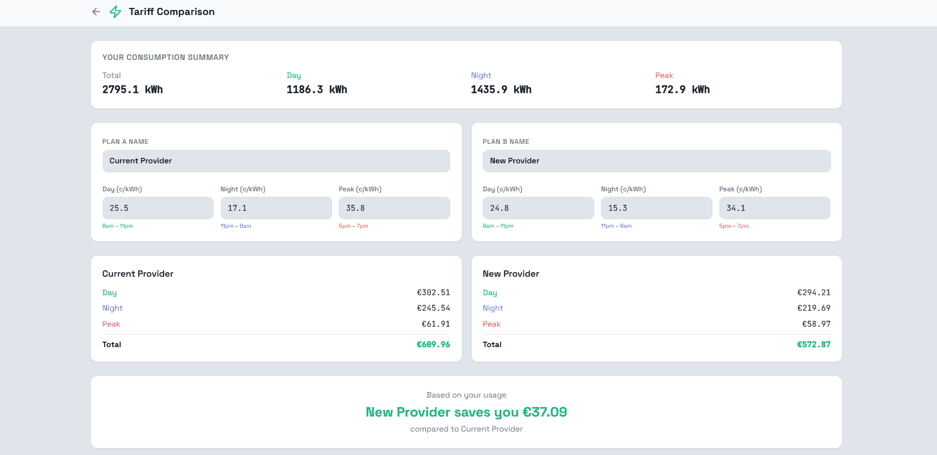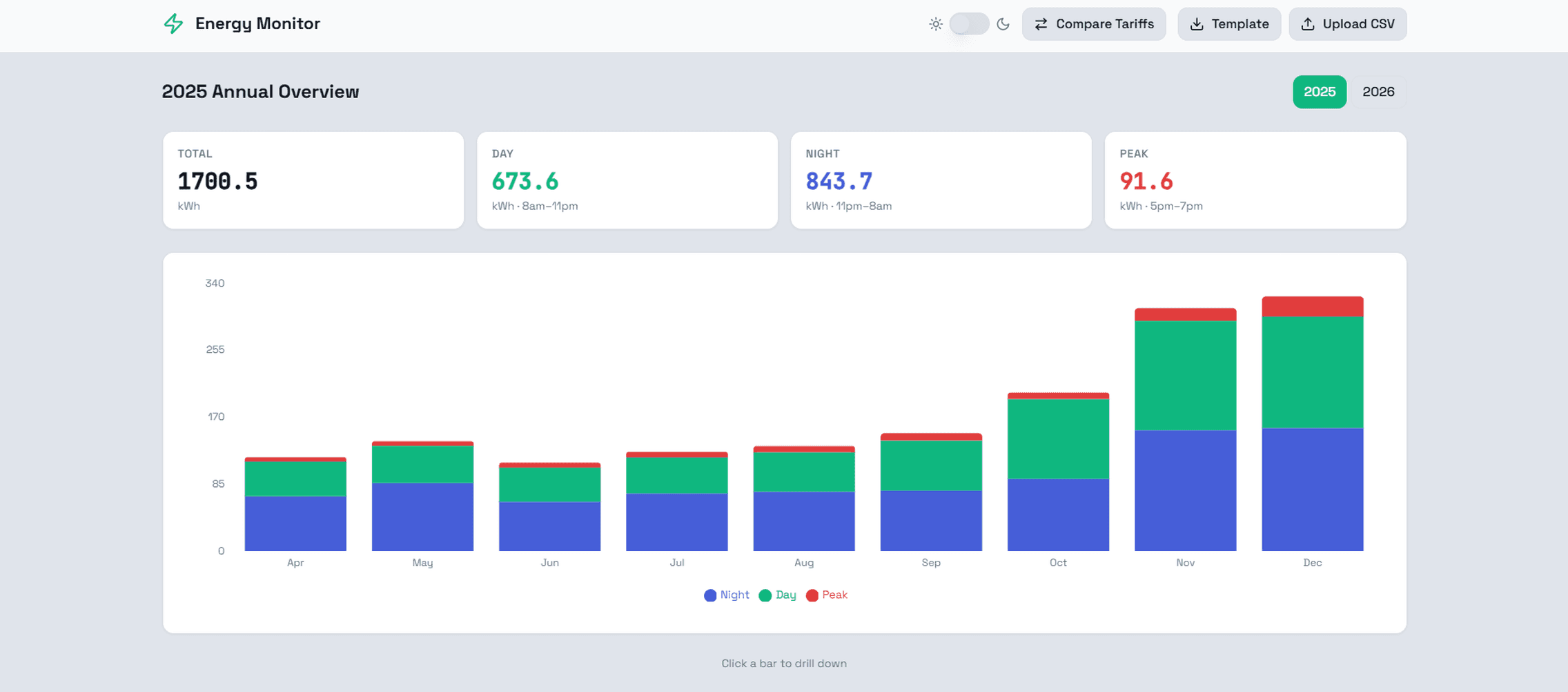 With vibe coding I created my own dashboard, not by opening a code editor but by opening a chat interface and describing what I wanted. I exported my half hourly smart meter readings as a CSV file and started talking. Thirty minutes later I had a working dashboard with monthly, daily and hourly consumption charts, drill downs, a day versus night band breakdown and a tariff comparison tool that let me compare providers using my own data.