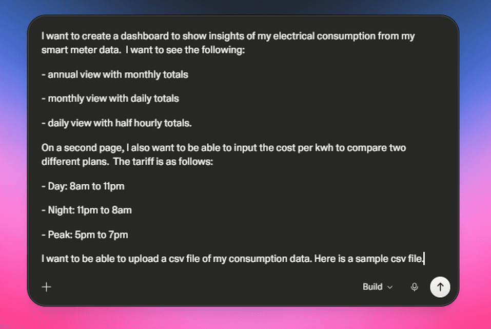 I quickly learned that it is important to understand how to “vibe”. For example “Build me a smart meter dashboard” produces something generic. “Build me a dashboard with an annual view with monthly totals, a monthly view with daily totals and a daily view with hourly totals” produces something immediately useful.
